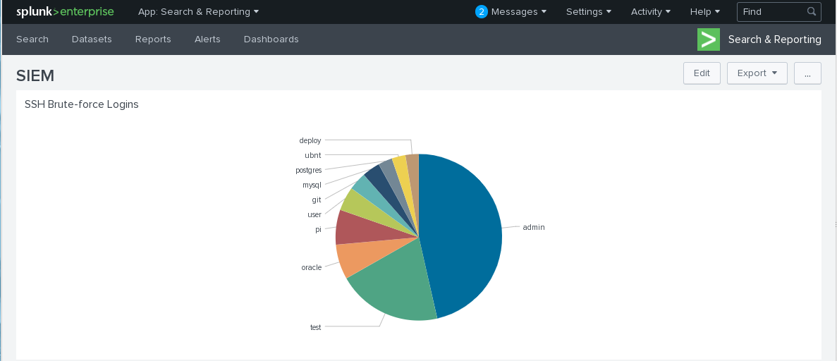 We limited our output to the top 10 usernames and sorted the list in descending order. Now we can see that the user ‘admin’ over the last 30 days is the most frequently attempted username for this attack. We can take this process one step further and utilize data visualization with dashboards, which gives us: