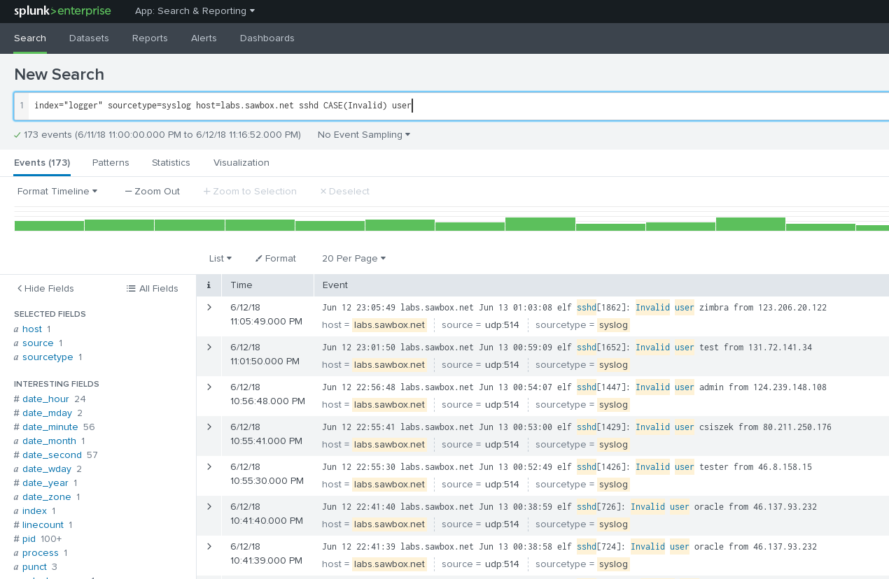 index=“logger” sourcetype=syslog host=labs.sawbox.net sshd CASE(Invalid) user