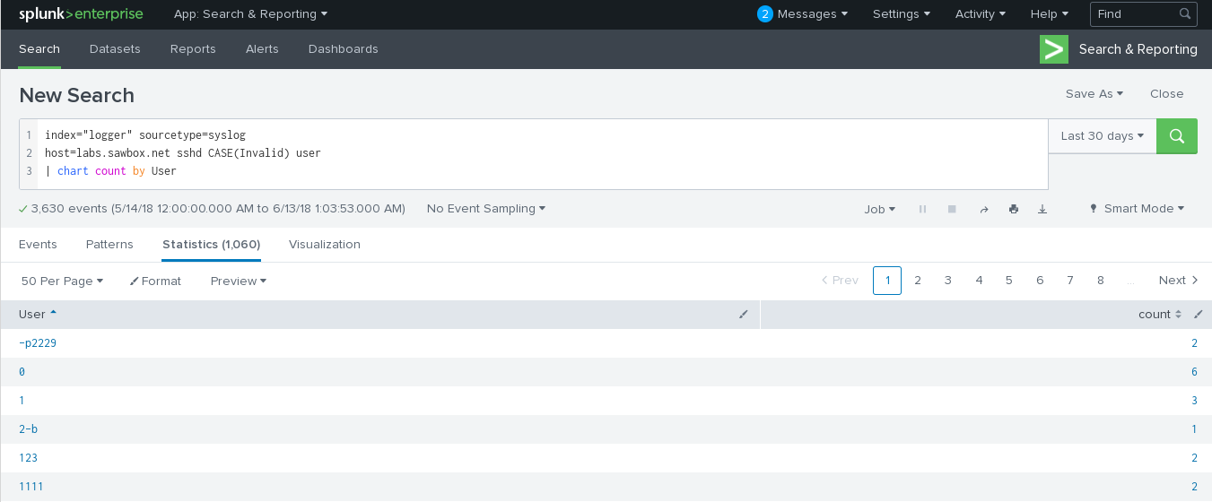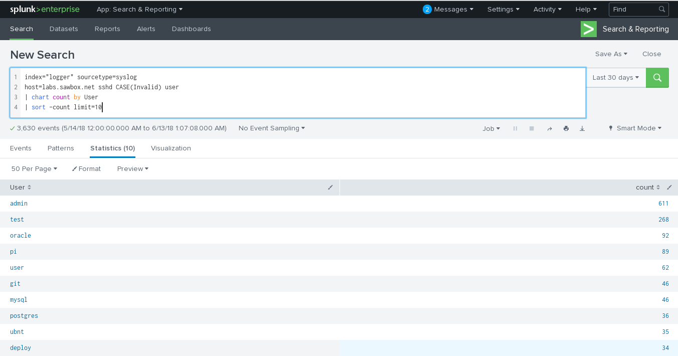 index=“logger” sourcetype=syslog host=labs.sawbox.net sshd CASE(Invalid) user | chart count by User