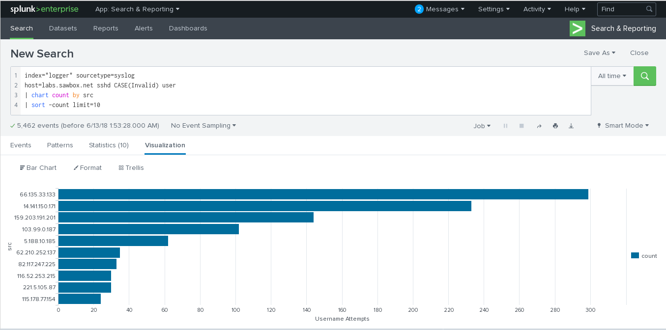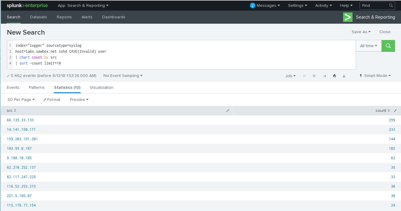 index=“logger” sourcetype=syslog host=labs.sawbox.net sshd CASE(Invalid) user | chart count by src | sort -count limit=10