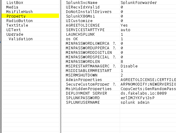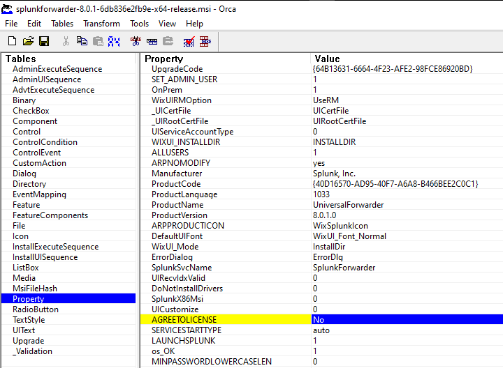 Once you have all the software downloaded, install and open Orca first, then from the Orca file menu, select file > open and navigate to where you have the Splunk UF MSI file. After the file loads, select Transform > New Transform. Next, select the ‘Property’ table in the left pane. In the right pane, change the ‘AGREETOLICENSE’ value to Yes.