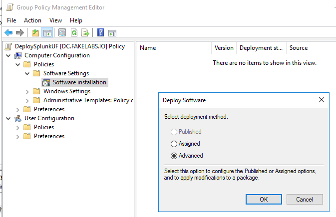 Login to your Domain Controller and use group policy management to create a new GPO, I called mine DeploySPlunkUF. Select Computer Configuration > Software Settings > Software Installation and be sure the radio button for Advanced is selected.