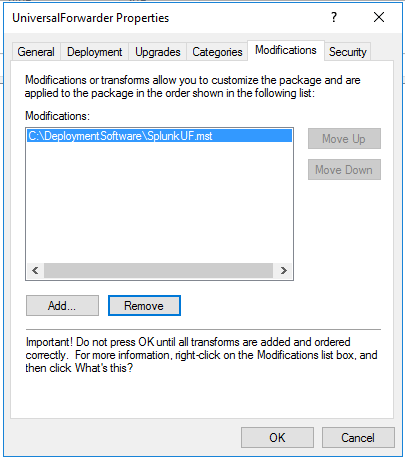 Under the modifications tab select ‘Add’ and navigate to where you copied the MST file. Leave the other tabs at their default values unless you have other operational requirements.