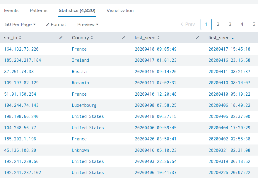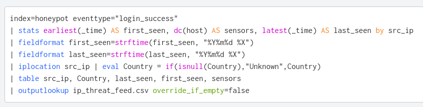 The IP address list alone has limited value. We can make the data more useful by adding additional context. We can pull in third-party IP reputation information from Virus Total or ABuseIPDB and many other providers. The graphic below contains another Splunk query that enhances the IP address list with the associated country, last-seen-time, and first-seen-time.