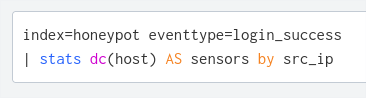 The objective is to consolidate IP addresses from attackers that have gained unauthorized access to at least one server. Capturing IP addresses that only scan or connect to one of our servers is not a high confidence metric in terms of determining whether they are a malicious actor or compromised machine. The additional requirement that they must also gain entry provides enough confidence that the source address has malicious intent. We can use a Splunk query to achieve the objective and bucket the aggregated log events that have source IP addresses with a login_success event type.