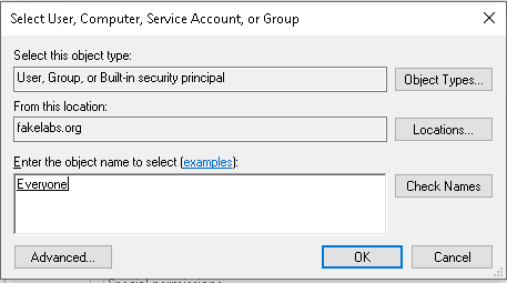 New-Item -Path c:\Users\mechanic\tokens\token_tpl.txtNow using the windows explorer file manager, simply right click the token_tpl.txt file and select properties > security > advanced > auditing. Then select ‘Add’ followed by ‘Select a Principal’. You should be presented with the following prompt: