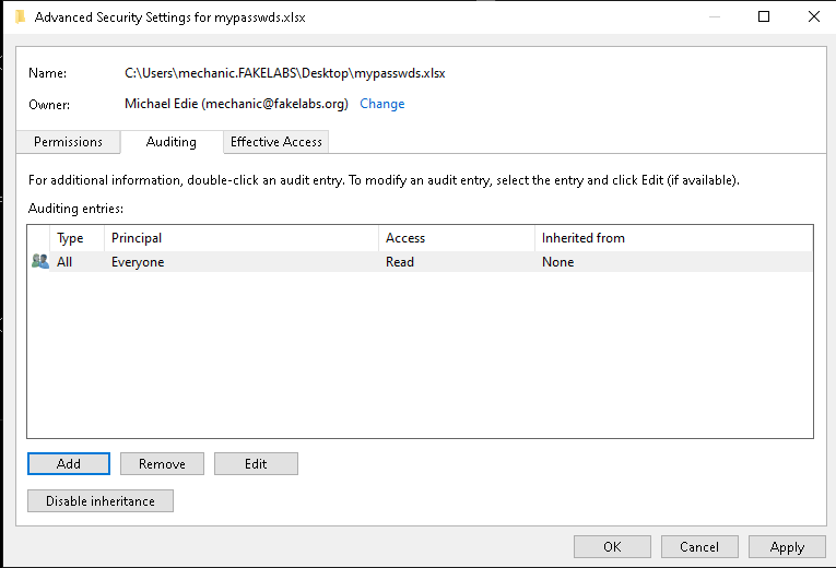 Once you have chosen your honey token files and have them ready for deployment we will now create a template file configured with the file audit ACL we need to apply to our honey tokens once they are placed on the remote systems.