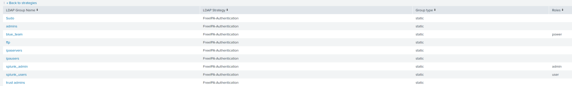 Once you map each FreeIPA group to a Splunk role you can see the listing at a glance as shown below: